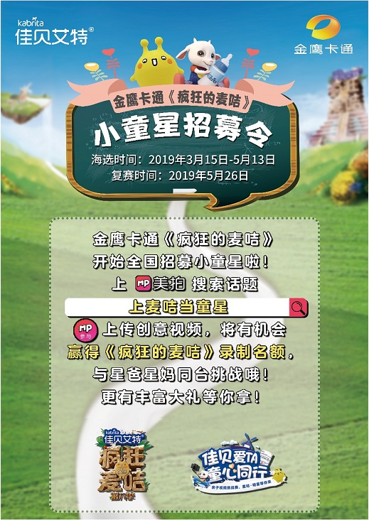 从媒介造势到线上造势,再到线下造事,佳贝艾特携手金鹰卡通,旨在通过麦咭童星的招募选拔,诠释双方共同倡导的亲子陪伴理念。想让孩子踏上这场奇妙的麦咭闯关挑战之旅吗?想和星爸星妈面对面交流育儿经吗?那就给孩子拍摄创意短视频,上传美拍参与#上麦咭当童星#话题挑战,开启一场专属于你和孩子的别样亲子体验吧!